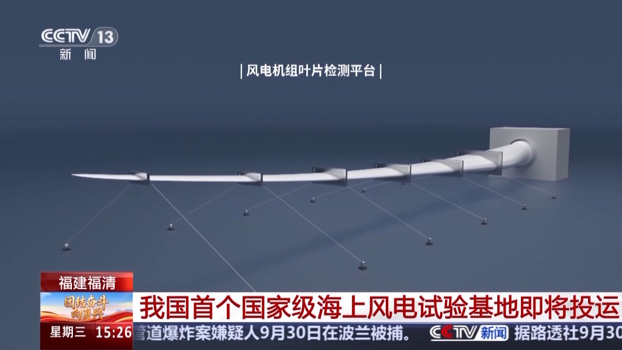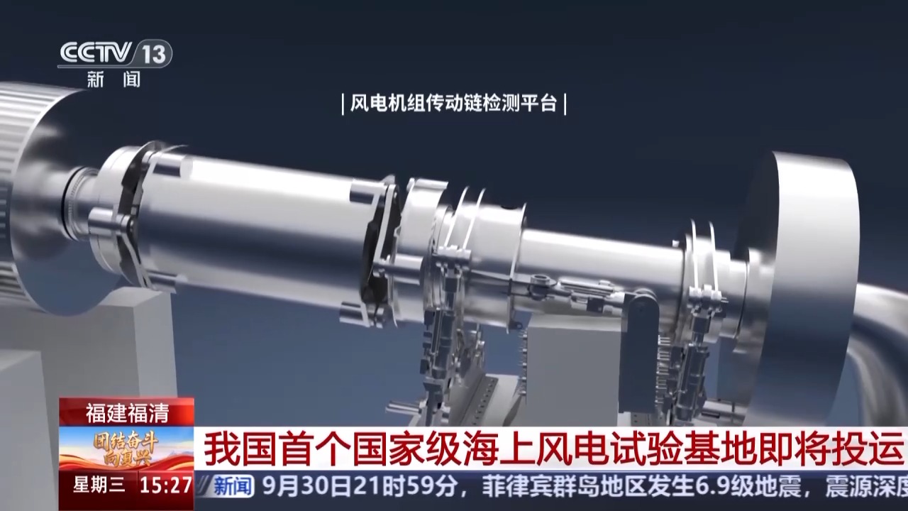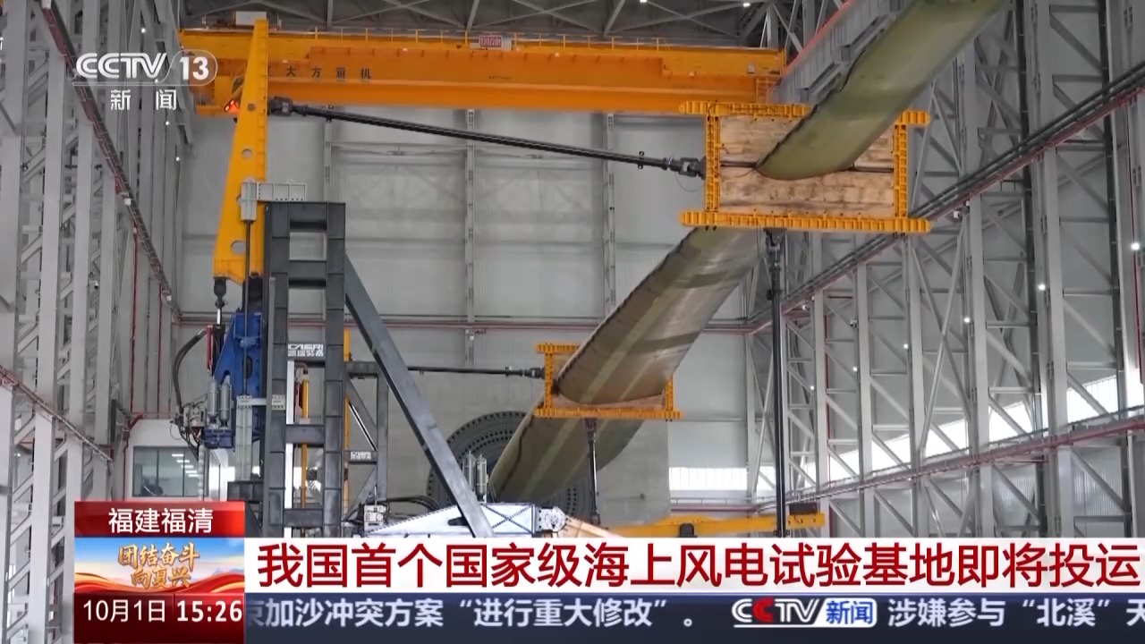 总台记者 黄珊:海上风电试验基地包括陆上检测中心和试验风电场两部分,陆上检测中心坐落于福清市的江阴产业园内,靠近江阴港码头,旁边是福建最大的风电产业园。整个陆上检测中心包含了叶片试验平台和传动链测试平台。